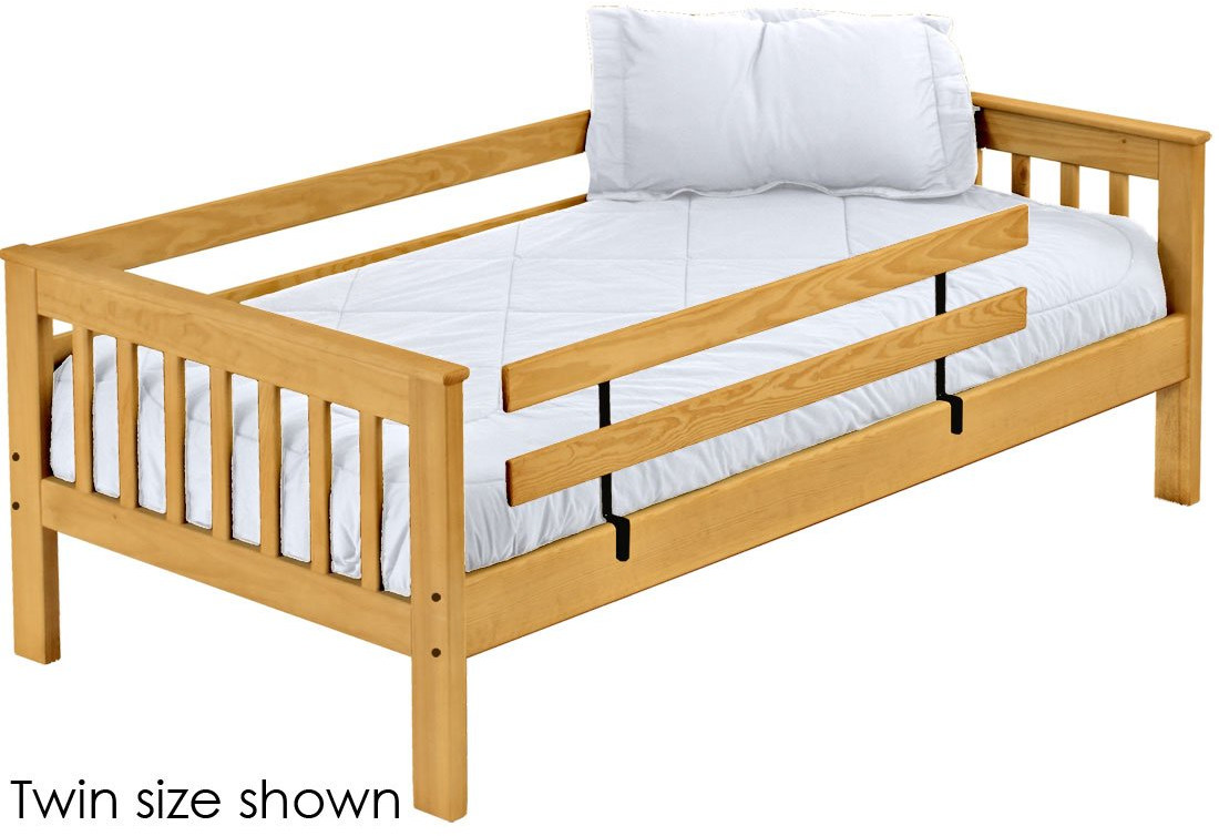 A full length rear guardrail and a removable front guardrail are included. Options include extra-long for big kids.