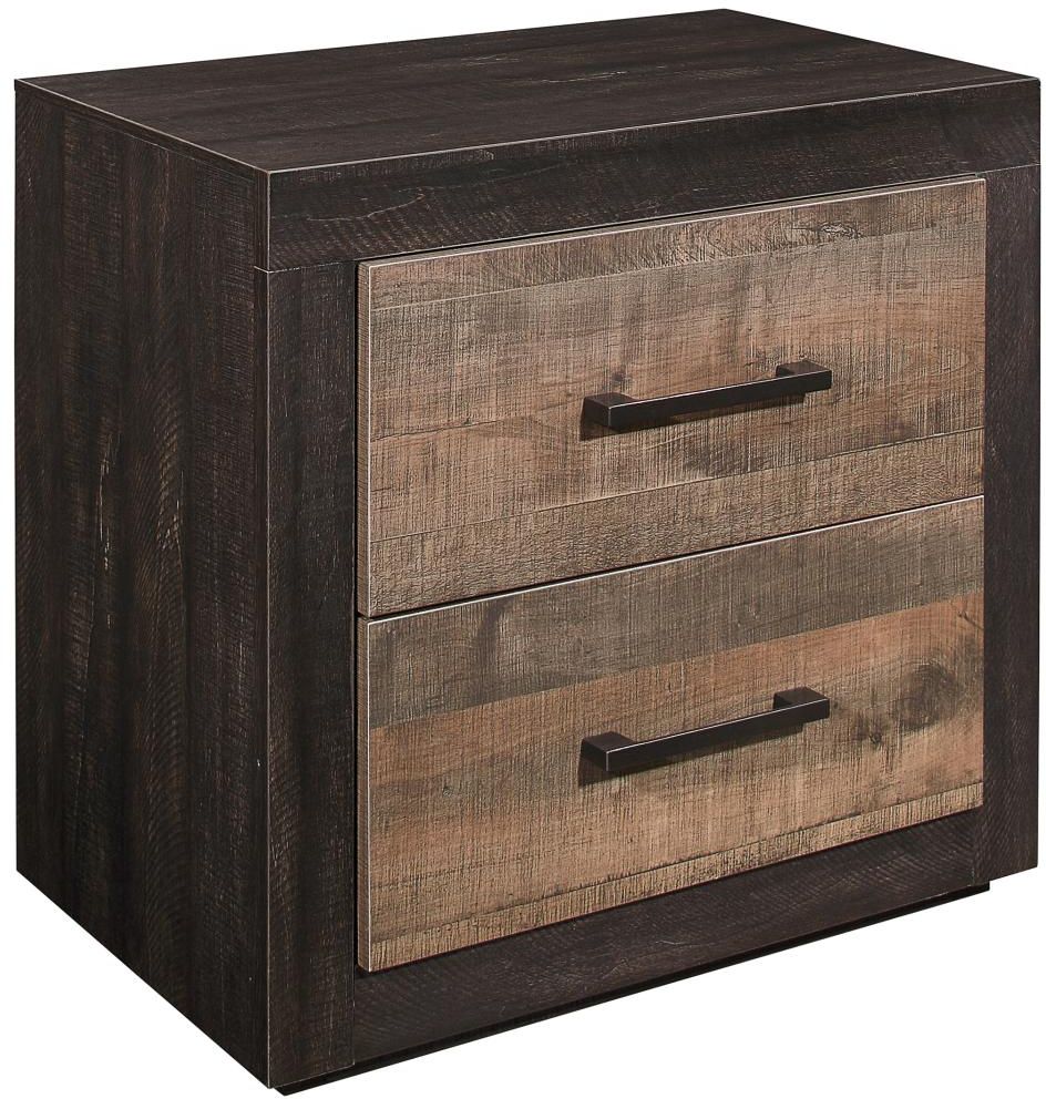 The Miter Collection combines the clean lines of contemporary styling with the look of natural wood grain in this stylish bedroom suite. 3-D printed paper veneer is utilized in both mahogany and ebony to achieve a 2-tone contrasted finish. Dark metal hardware provides additional contrast to the printed wood grain. Drawers are featured on the footboard creating the extra storage space.Read More