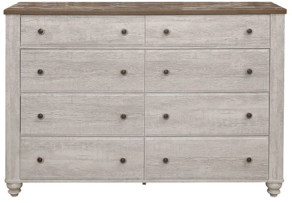 Transitional-rustic styling is expertly achieved in the design of the Nashville Collection. The two-tone faux wood look of melamine provides distinct contrast with antique white and brown lending visual texture to the dresser. The classic framing of the collection is paired with knob hardware that features white wood and black metal, to complete the rustic look.