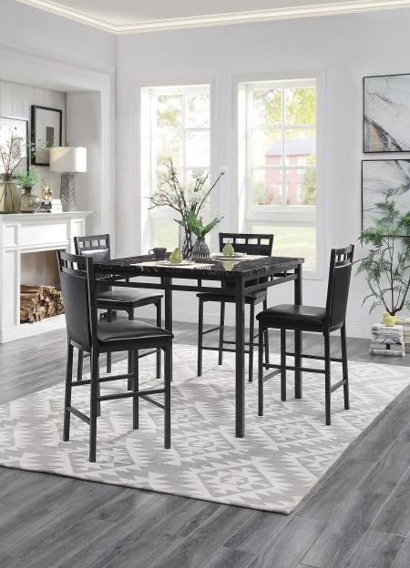 Designed for your modest dining space, the Olney Collection provides a stylish and functional surface for your mealtime needs. Offered in two convenient table heights, this five-piece packed collection is available in both dining and counter height. The metal table base rises to support the faux marble fixed tabletop. Vertical accents grace the table apron and the top rails of the dark brown bi-cast vinyl covered dining height and 24-inch height chairs.