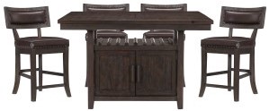 The rectangular counter height tabletop is supported by a functional storage base, allowing for discrete placement of your tabletop accessories. Contoured-back, wood-framed, 24-inch height chairs feature nail head accent and espresso faux leather seats that perfectly complement the rustic look of the Oxton collection.Read More