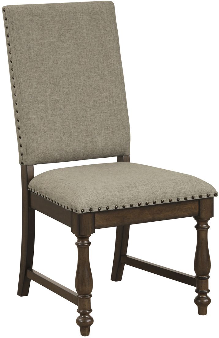 The wood-framed side chair features a beige fabric-covered seat and back with accenting nailhead trim.