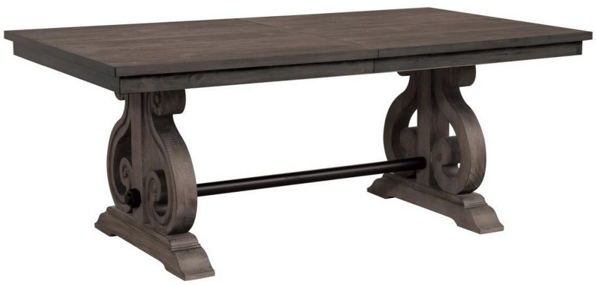 The heavily scrolled base supports of the table feature routing with dark pewter-finished metal trestle that connects. Distressed dark oak finish provides texture to the acacia veneer of the table.Read More